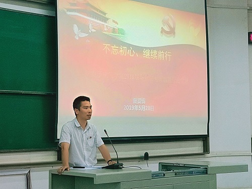 夏贤辉书记以“不忘初心,继续前行”为主题发表讲话。他从“不忘初心,方得始终;铭记校训,砥砺前行;树立榜样,贡献力量”三个方面对同学们提出具体要求并寄予希望,希望大家把党章要求、党纪规范、使命担当、理想信念内化于心,外化于行,牢记党员身份,始终保持共产党员的先进性和纯洁性,加强自身修养,从我做起,从身边做起,从现在做起,用我们的学习与工作来诠释一名共产党人的初心和使命,为党的事业和各项建设不懈奋斗!