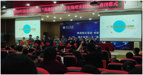 物理奠定基础,创新引领未来------10月28日下午,湖北省第四届“源鑫圆杯”大学生物理实验创新设计大赛在湖北工业大学落下帷幕。本次大赛由湖北省教育厅主办、湖北工业大学承办、武汉光驰教育科技股份有限公司协办。本次大赛共有来自全省的33所高校的323余件作品参加决赛,其中,我校4件作品入围,经过激烈角逐,有3件作品获奖,分别为一等奖、二等奖和三等奖。