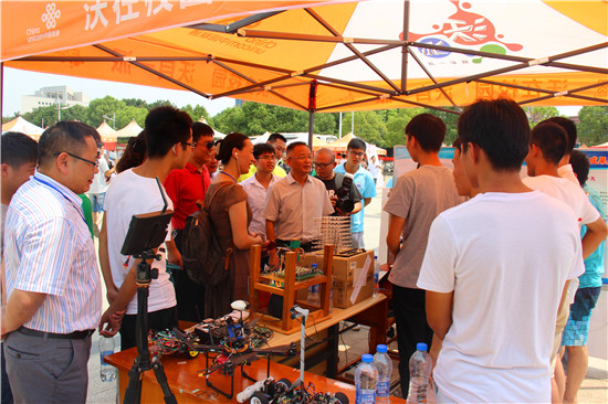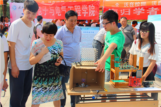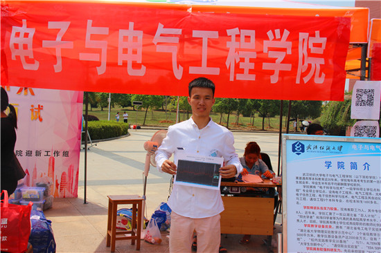 迎新工作紧扣专业特点,依托学生创新团队在学院迎新点,分别以展板和实物的形式展出了湖北省大学生电子设计竞赛作品。其中,在学生自主研发的“心电图仪”电子作品前,副校长罗锦银一行饶有兴致地观看了“心电图仪”的演示,可以记录每位学子入校的心电信号波形,每位新生都可佩戴试验,心跳脉搏及时抓拍、实时打印输出,记录新生的激动心情,为每位新生留下了脉冲波浪线作为开学的“心跳回忆”。