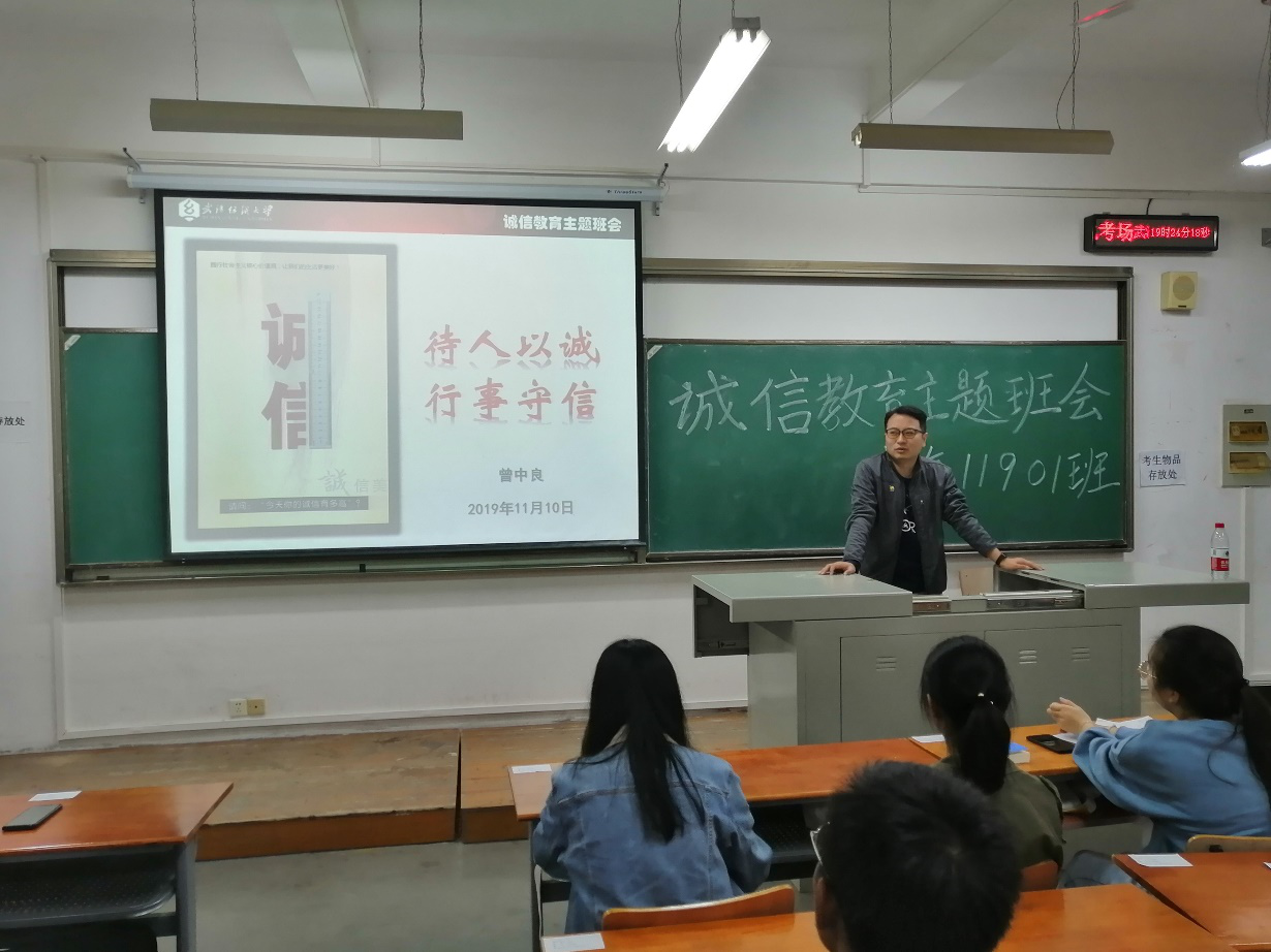 班主任曾中良老师以《待人以诚、行事守信》为题做了专题宣讲,他从诚信的本质、诚信的重要性以及当代大学生如何把握诚信等三个部分做了基本阐述。