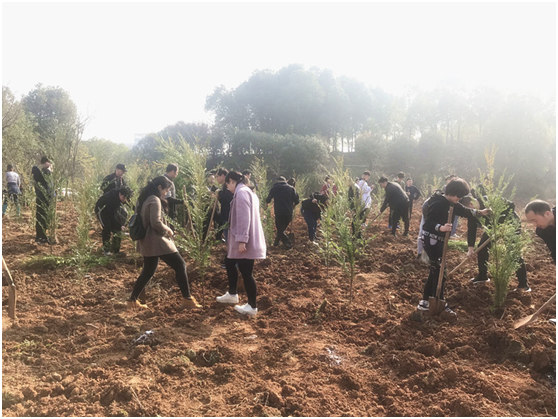细心的后勤集团人员早已将树苗运送到现场,而且已经把栽种树苗的坑位画好了,大家分工明确,两人一组,配合默契,一人一锹,挖坑、放苗、埋土、踩实、培土,一排排树苗就这样拔起而起。还有人指导栽树,现场是此起彼伏的声音:“大家种好树之后一定要用脚踩实”,“这个坑要再挖深一点”,“你来扶一下树苗,我来填土”,“这个坑不要太深了,容易积水”,“我们把这一排来补齐”。
