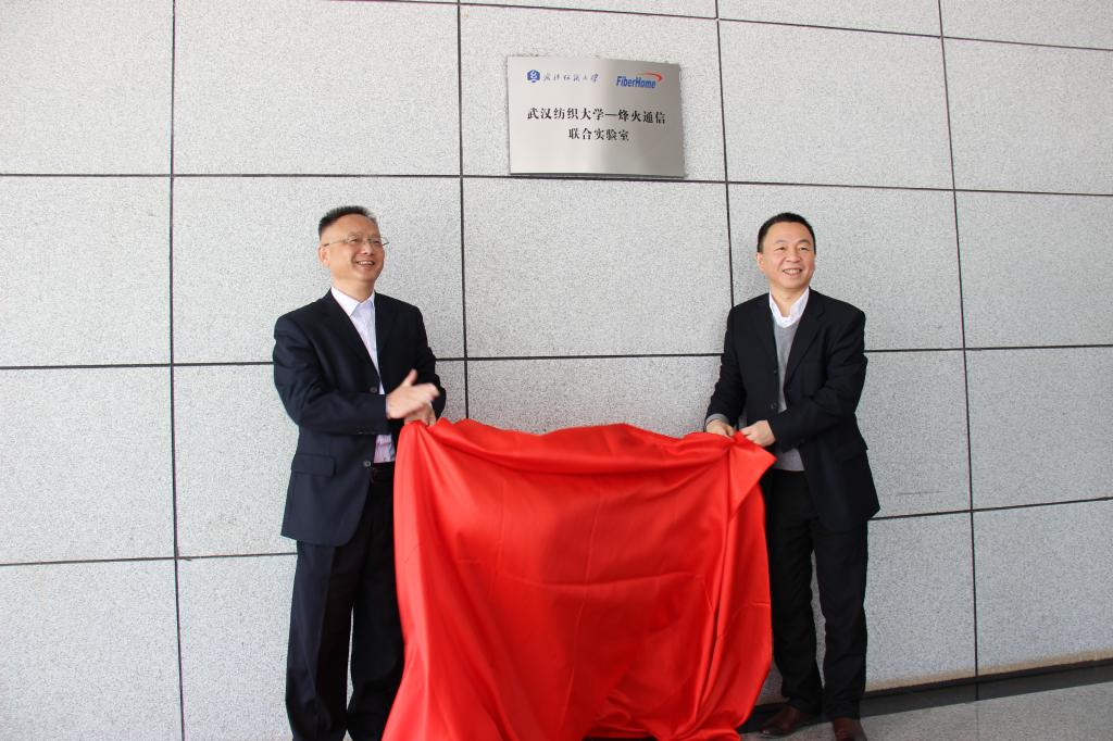 参观结束后,副校长罗锦银和烽火科技总裁助理邹辰一同为武汉纺织大学-烽火通信联合实验室揭牌。