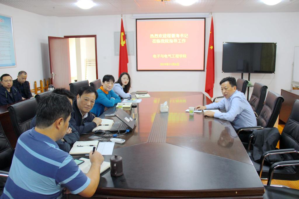 11月6日上午,校纪委书记程碧海到电子与电气学院调研指导工作,走访检查了学院实验室,听取了学院工作汇报,对学院工作提出了明确要求。学院领导班子成员和系(中心)负责人参加了会议。