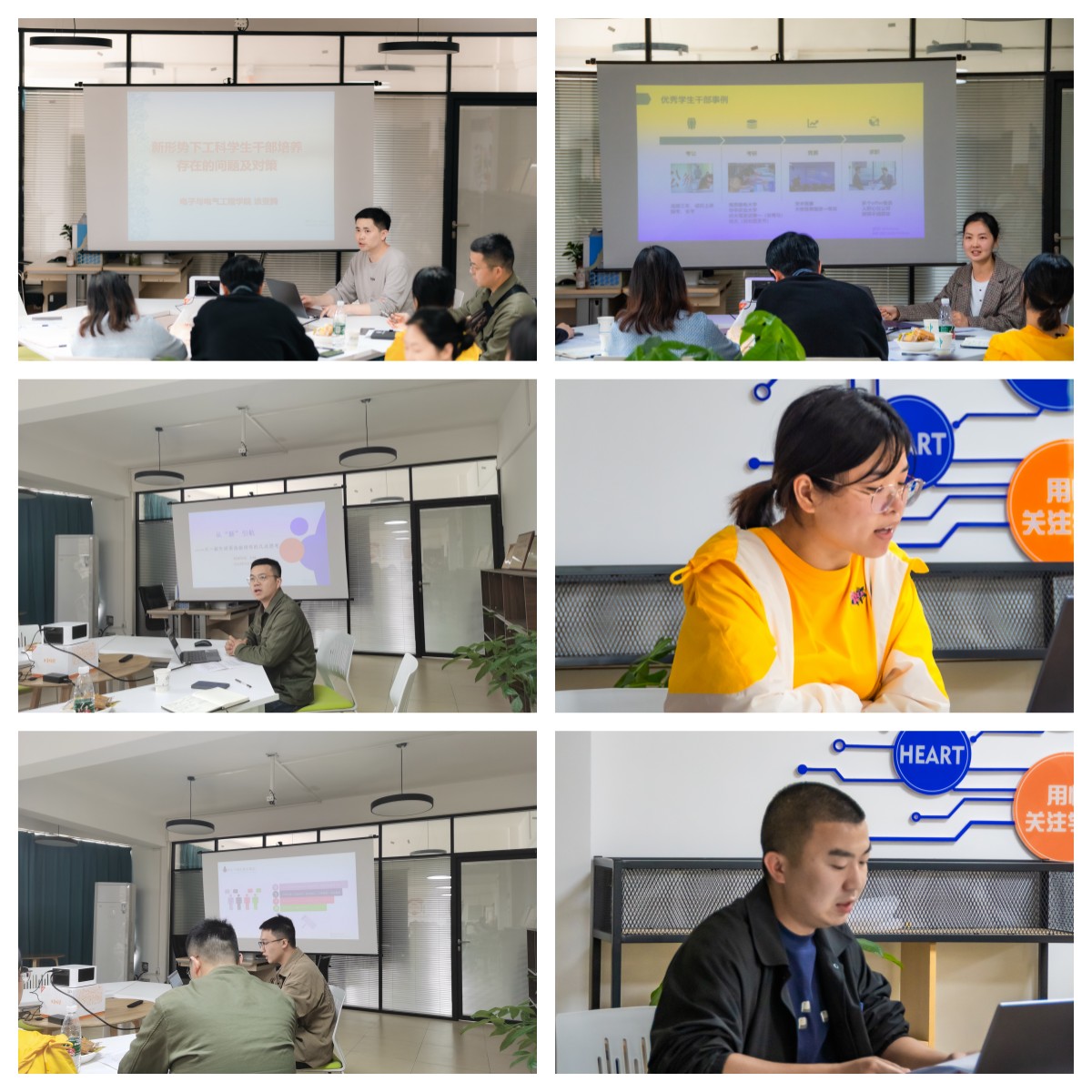 涂亚腾老师以《新形势下工科学生干部培养的问题及对策》为主题,结合工科学生干部的特点,提出加强学生干部的思想建设,用好网络,加强学生干部的日常培训等措施加强学生干部培养。数理学院方媛老师以《朋辈领航,星火聚光——学生干部的处境和发展分析》为题,提出深化职责认知,提升业务能力;注重能力培养,选拔后加强培养和指导;给予资源倾斜等措施提升学生干部的能力和素养。机械学院方林老师以《从“新”引航——大一新生班委选拔培养的几点思考》对新生班委的选拔任用提出思考,他总结为说给班委听、启发班委想、带着班委干、督促班委练,从而使新生班委克服“官”念,养成“团结、教育、服务”的工作作风,从而增加其战斗力和号召力。材料学院曾玉竹老师以《“05后”学生干部培养的新情况、新问题、新思路》对“05后”学生以及学生干部进行了分析,她认为辅导员老师是学生干部培养与管理的主导力量,选人比用人重要,培养比管理重要,过程比结果重要,人格魅力比行政指导重要。环境工程学院张宇航老师以《培养有责任意识的学生干部》为题,从强化角色意识、成才意识;培养责任意识、自律意识;培养服务意识、回馈意识等几个方面提出加强培养有责任意识的学生干部的方式方法。传媒学院汤若釴老师以《如何发挥学生干部在宿舍党建育人工作中的先锋作用》为题,探索学生干部在新时代学生宿舍党建工作新模式中的作用和现状,他认为构建“一室一廊一栋一中心”一体的党建育人主阵地,能有效提升学生干部在宿舍党建工作新模式中的作用和效果。