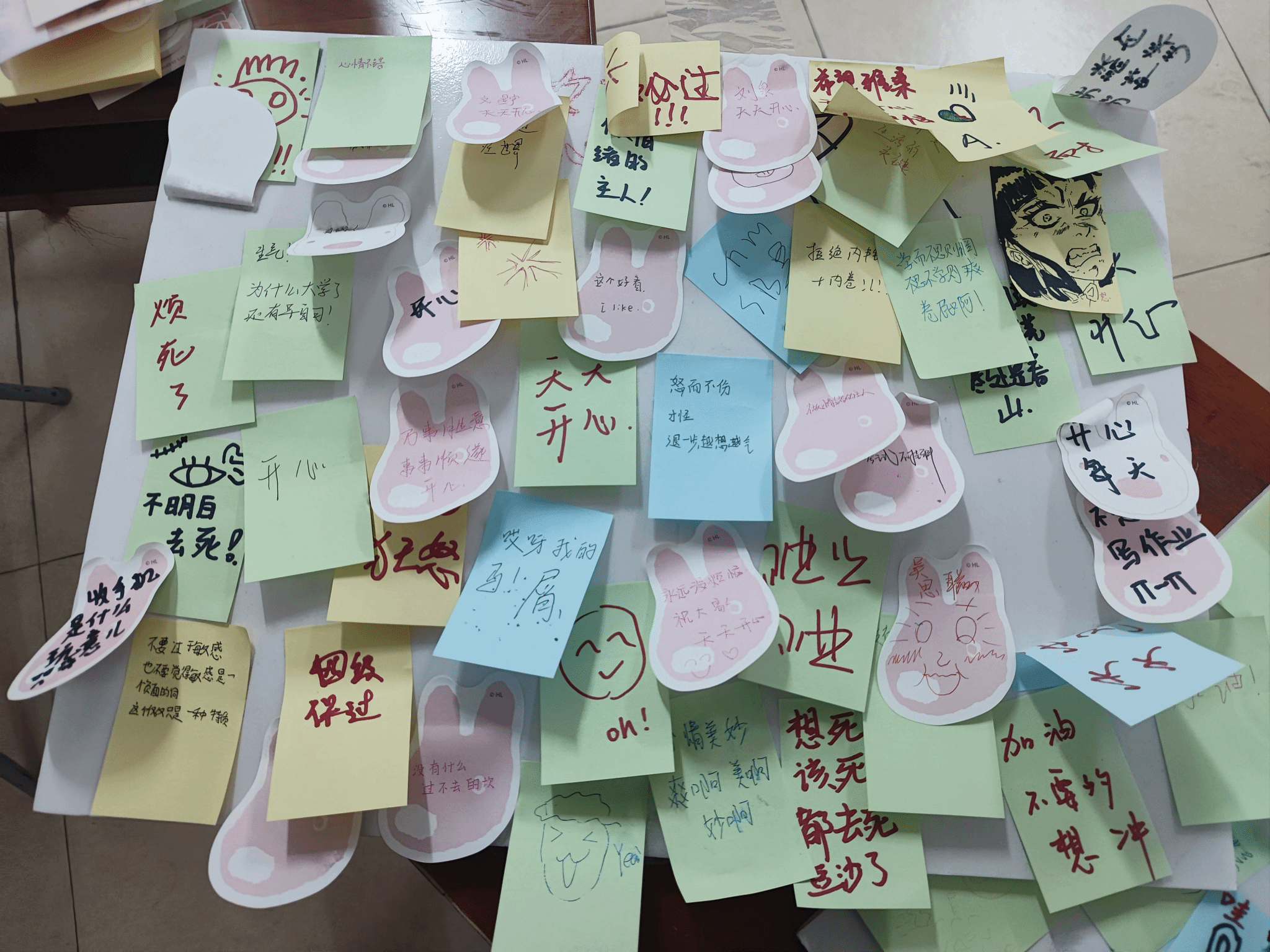 本次活动中,我院心理部为同学们准备了便签,彩笔和四块代表不同情感的板子,同学们可以在板子上用文字或者是绘画的形式记录下自己对于某一事物带有怎样的感情,完成的同学可以获得一份心理部准备的小奖品。活动开始时,大部分同学都只选择用简单的文字来表达自己的心情,但随着活动进行,越来越多的同学加入进来,开始有同学用简笔画甚至更精美的画来表达自己的情感。活动现场同学们踊跃参与,互动频繁,整场活动都保持着不低的热度直到结束。
