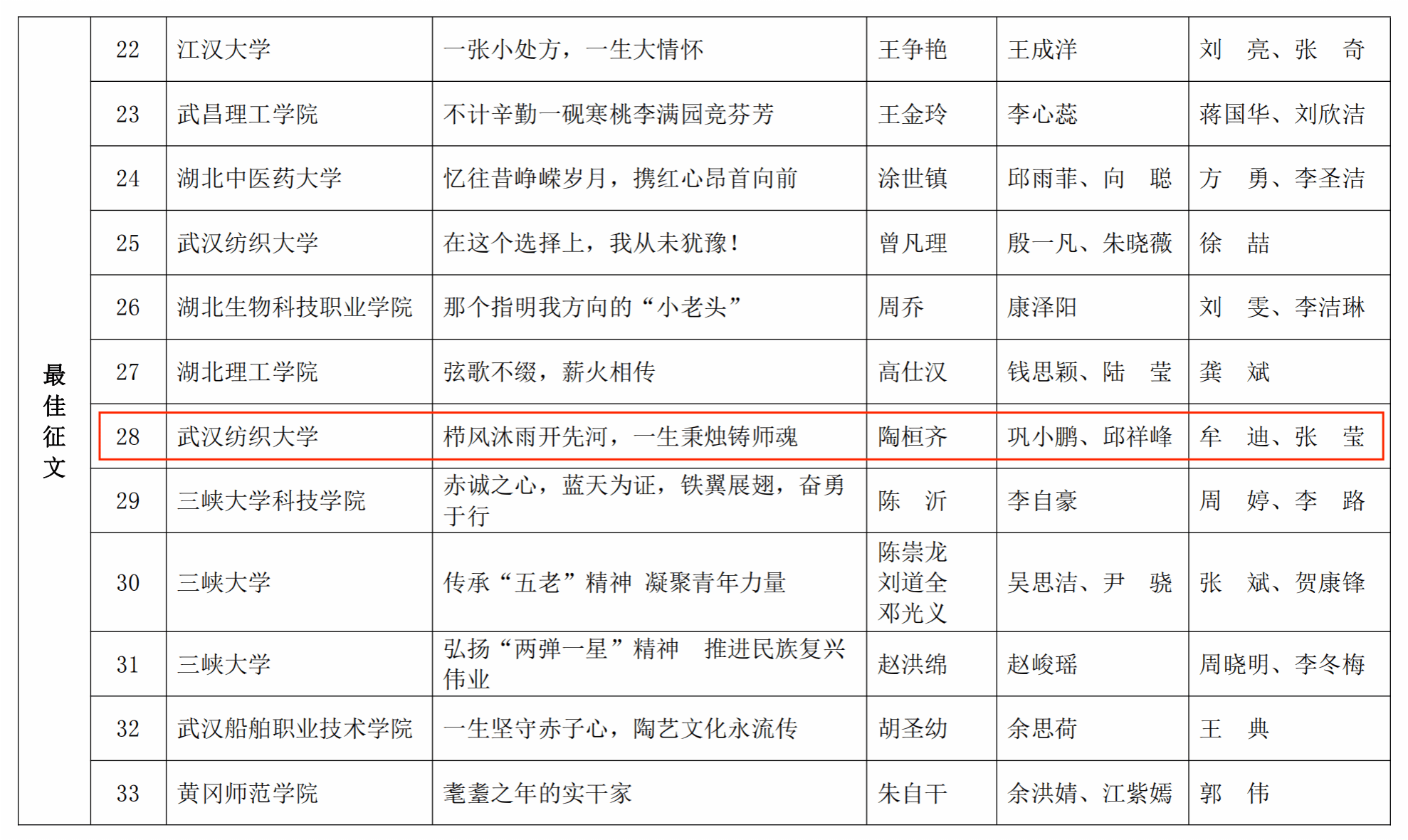近日,湖北省教育厅关工委“读懂中国”活动作品评审结果揭晓,经过专家评审,我院报送的征文《栉风沐雨开先河,一生秉烛铸师魂》获评最佳征文,视频《栉风沐雨开先河,一生秉烛铸师魂》获评优秀微视频。