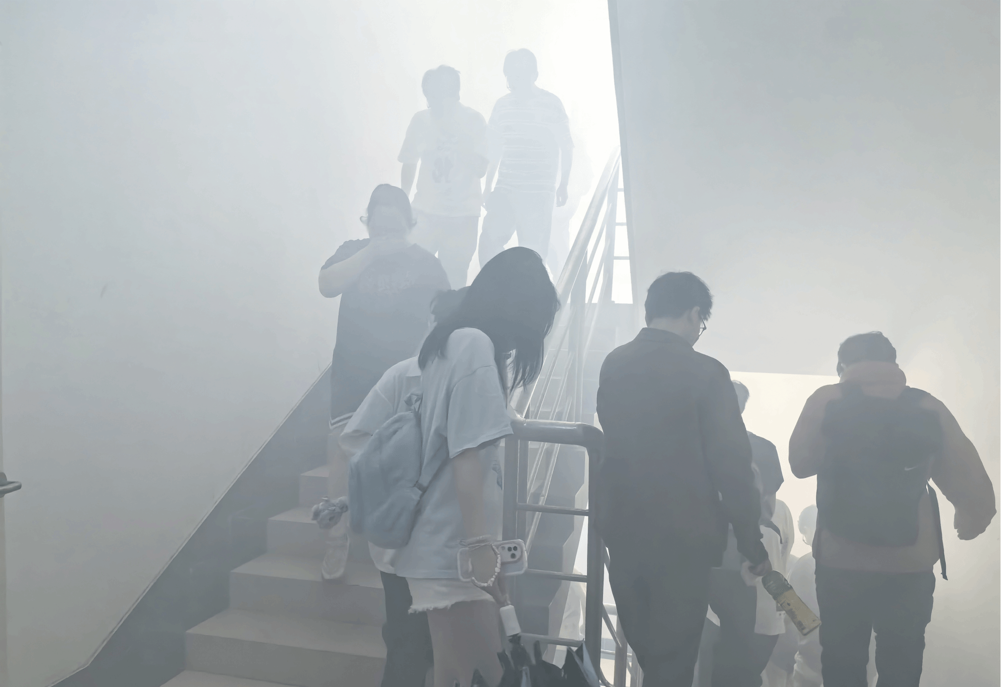 随后,消防疏散实战演练在“电燃梦想”一站式学生社区服务驿站进行。消防警报声响起后,参与演练的师生反应迅速,严格按照应急逃生路线有序疏散,用衣服等物品捂住口鼻,低姿、快速穿越烟雾区,顺利到达安全区域。刘诚老师结合现场演练情况,就如何预防火灾、怎样正确报警、逃生注意事项等进行了补充强调,提醒大家正确用火用电。