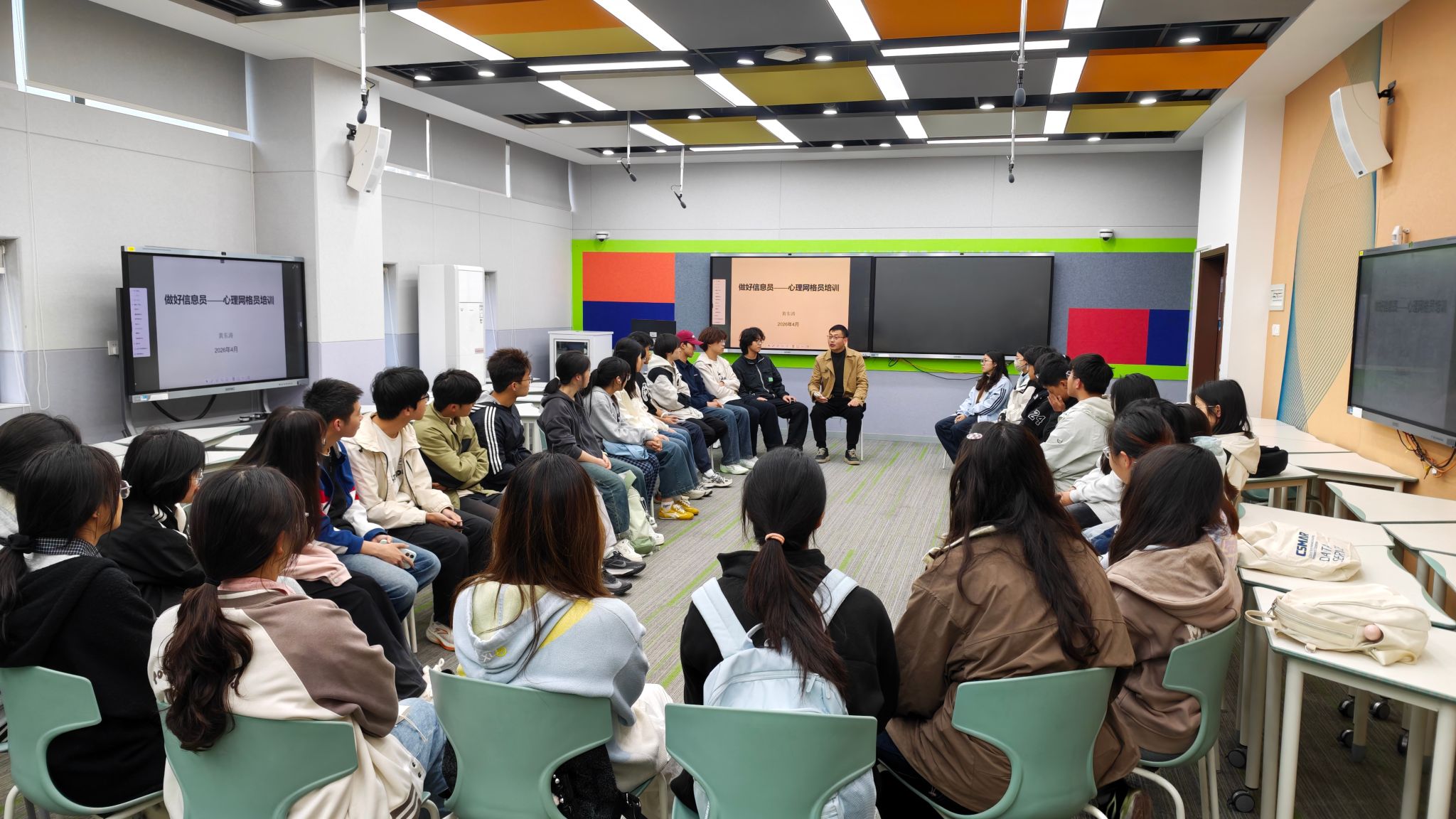 在阳光校区9栋智慧教室举办心理网格员培训暨2026年春季学期心理健康团体辅导活动。本次培训特邀湖北大学学生心理健康教育与咨询中心黄东涛老师担任主讲人,学院各专业共三十余名学生骨干参与活动,涵盖班委、寝室长、入党积极分子等学生群体。