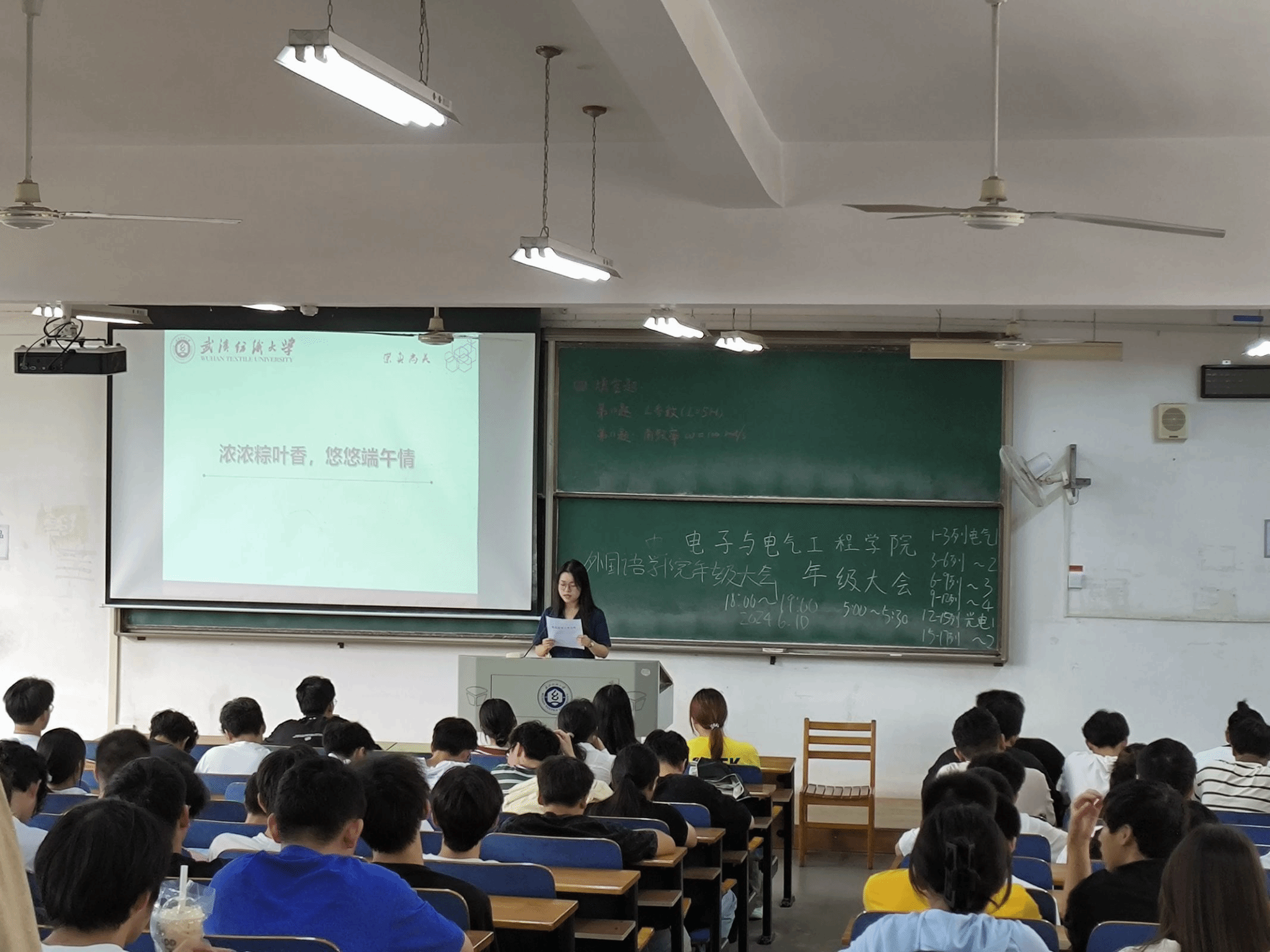 会上辅导员向学生们提到“传承民族基因,弘扬爱国情”、“节分端午自谁言,万古传闻为屈原。”屈原无疑是最醒目的端午文化符号。这一天,重温浓情假日,更感受到奋勇争先的民族精神、炽热深厚的爱国情怀。在端午节来临之际,各地举办了形式多样的活动,旨在传承和弘扬中华优秀传统文化,增强文化自信和归属感。端午节期间,各地还通过赛龙舟、制作和佩戴香囊、挂艾草等传统习俗,展现了浓厚的节日氛围。千百年赛龙舟,赛的是江河上同舟共济、奋勇争先,展现时代大潮中的上下求索。这些活动不仅弘扬了传统文化,还通过寓教于乐的方式,传承了爱国情怀,增强了社会凝聚力和文化自信。会上辅导员还开展爱国主义精神教育,引导学生们深入了解国家的历史、文化和传统,激发学生们的爱国情感和民族自豪感。